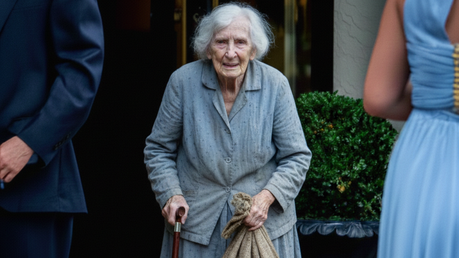 She walked slowly, wearing her old blue dress pressed neatly but visibly worn. Her hair was pinned back in a simple clip, her shoes didn’t match, and in her hands, she clutched a faded cloth bag with frayed corners and a stain near the zipper.