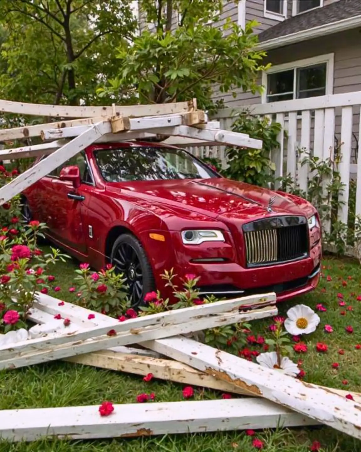 My fence, a structure older than most of the homes on this street, lay in shambles! Splintered planks were strewn across the lawn, some jammed into the bushes. And lodged squarely into the wreckage was a gleaming red Rolls-Royce, its rear end still partly inside my yard.